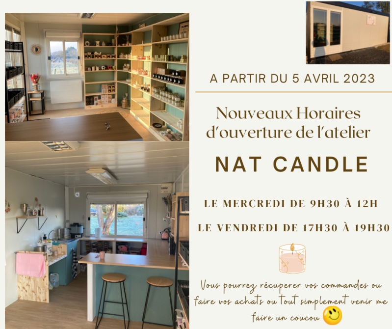 Passionnée par l'ambiance cocooning et chaleureuse qu'une bougie parfumée peut apporter, je me lance à faire mes propres créations, je dédie une petite pièce de ma maison qui devient "mon atelier" après quelques mois d'essais et encouragée par mon entourage et ma passion, Nat Candle (marque déposée à l'INPI) a vu le jour en octobre 2021.