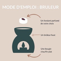 *Vous déposez votre fondant sur la partie haute du brûleur, une bougie chauffe plat dans la partie du bas vous allumez et vous profitez de son parfum qu'il diffuse (l'odeur est diffusée en seulement quelques minutes, vous pouvez le rallumer autant de fois qu'il dégagera encore de l'odeur environ 8 à 10 h suivant les parfums)