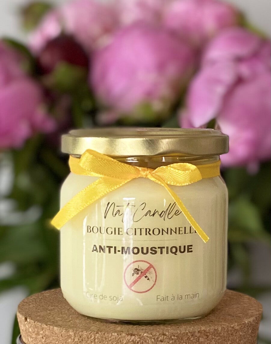 Je vous propose une bougie à la citronnelle, une expérience olfactive à la fois rafraîchissante et fonctionnelle pour votre maison avec sa fonction répulsive pour les moustiques.