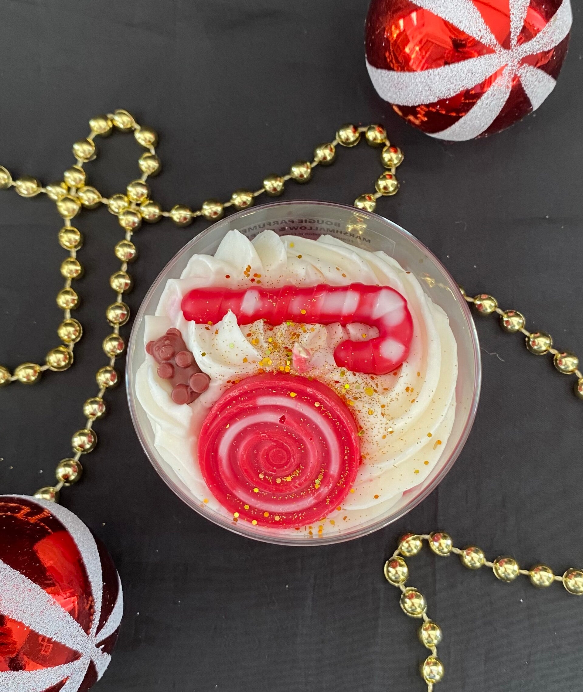 Ses volutes blanches et rouges rappellent les célèbres confiseries de Noël, tandis que son parfum allie la douceur du marshmallow à la gourmandise du sucre d’orge.