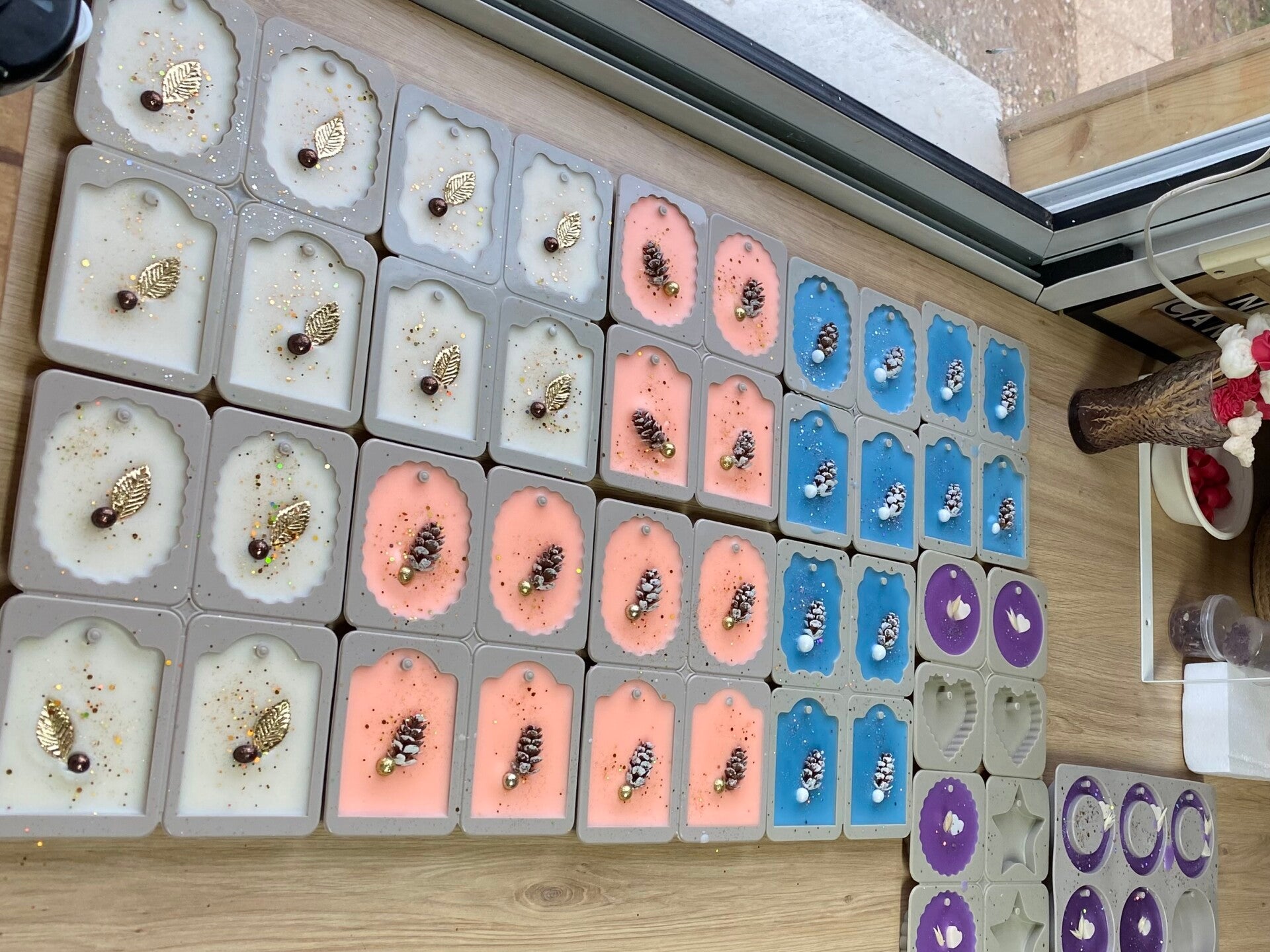 De petites créations féeriques, coulées à la main en cire de COLZA et décorées d’éléments naturels dorés.